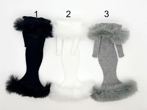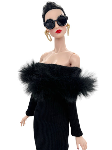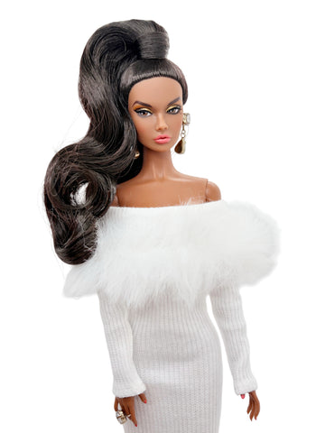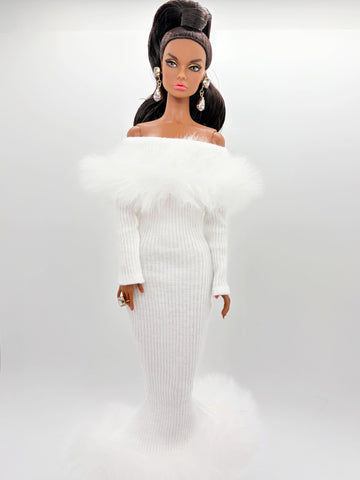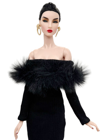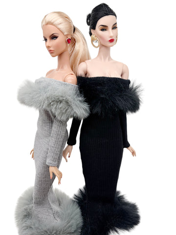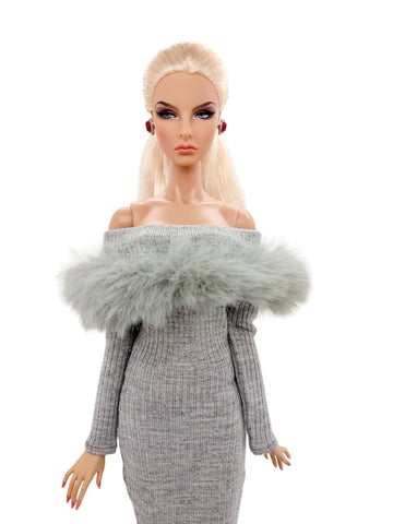 C012 Off-Shouldle Ribbed Slim Fit Dress with Faux Fur Trim & Fishtail Hem Handmade for 12" Fashion Dolls Like PP, Fashion Royalty, NuFace